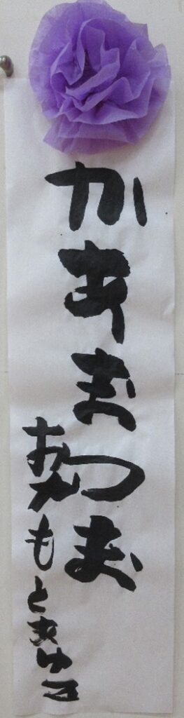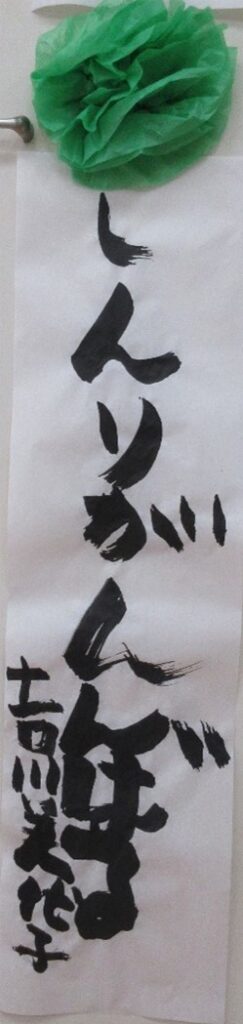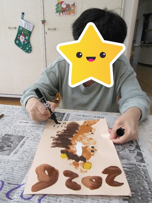 書初めでは、今年の目標や好きな言葉など、自由に書きました。絵を描くのが得意な利用者さんは、大好きな猫と🐱🐈と遊んでいる様子を紙いっぱいに書きました。