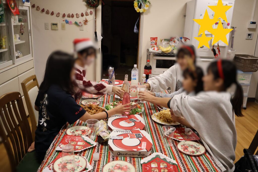 今日の夕食はたくさんのおいしい料理が出るので、「早く時間にならないかな~」とワクワクしています。みんなで食事を並べて、飲み物も準備して、せーのっ!