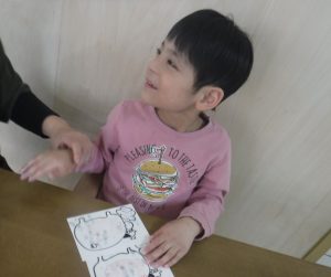 子どもたちの足形を白鳥の羽に見立てて制作しました。絵具の感触に足指をもぞもぞさせていましたが、上手に型をとることが出来ました。 雪だるまは顔のパーツを貼ってもらいました。個性豊かな雪だるまが完成しました。