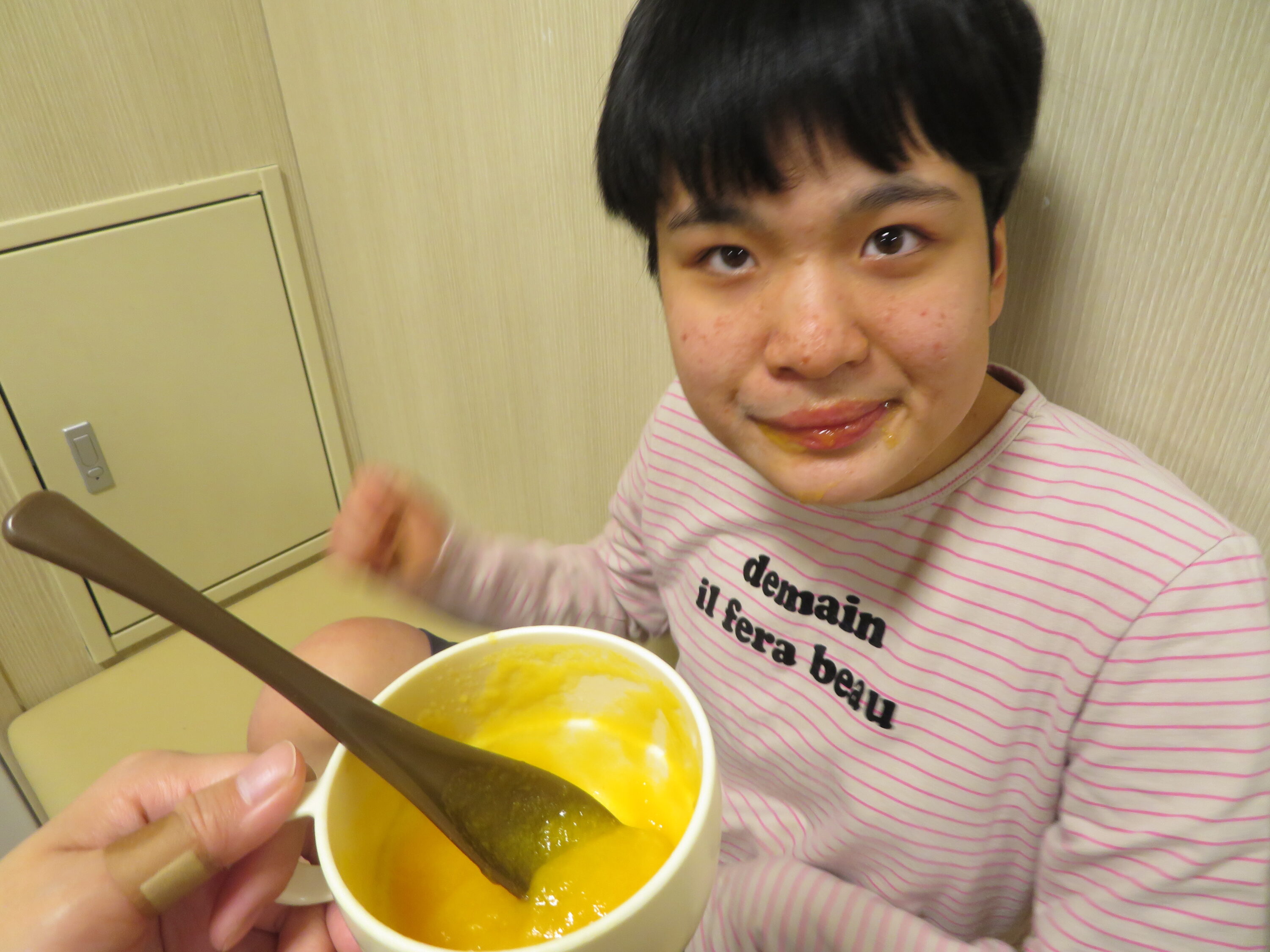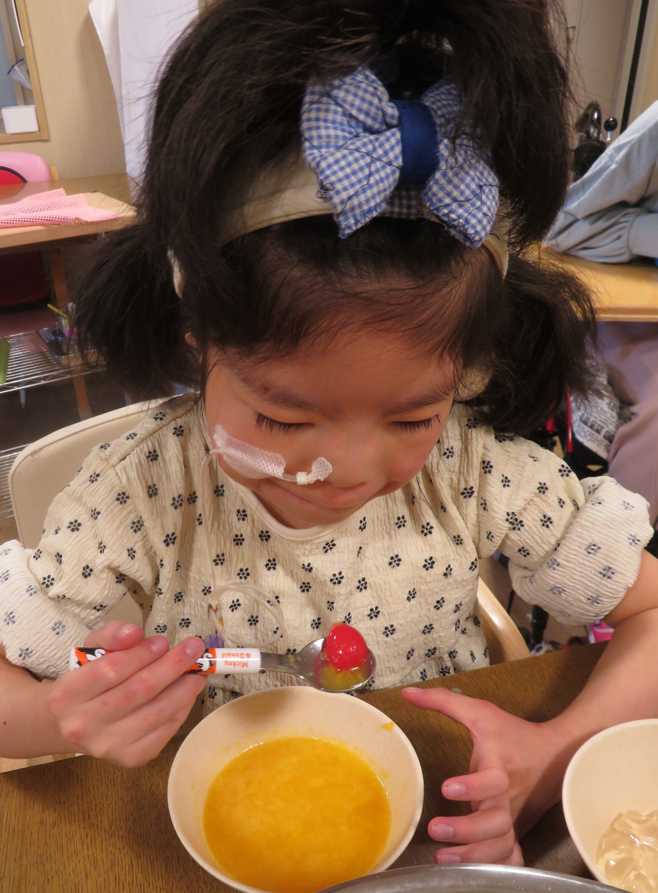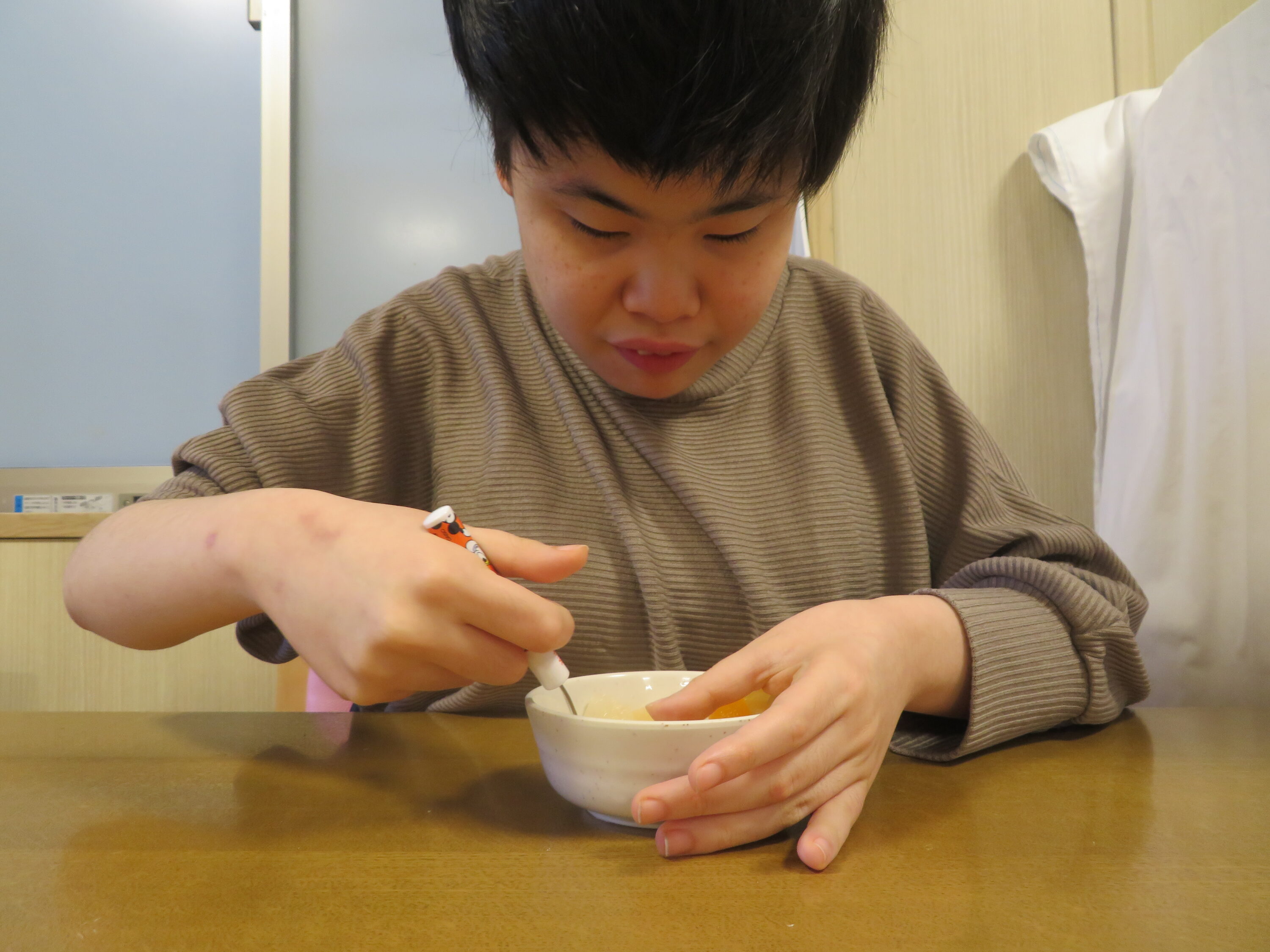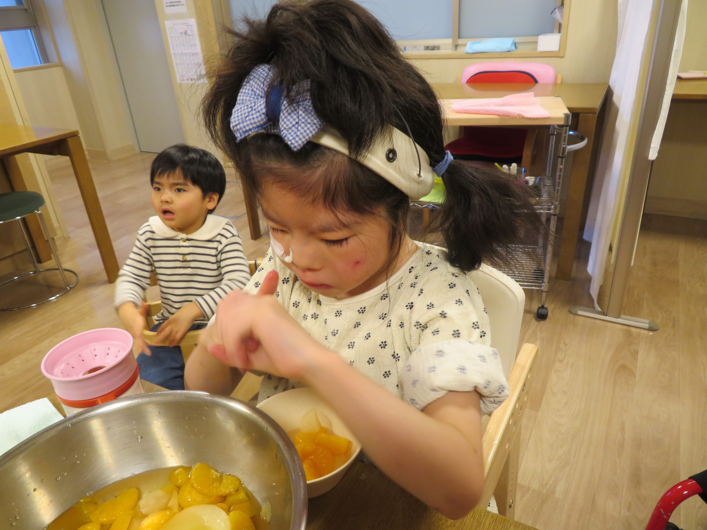 缶詰に入っている沢山のフルーツをボウルに入れる作業や自分のお皿に盛り付ける作業も行いました。